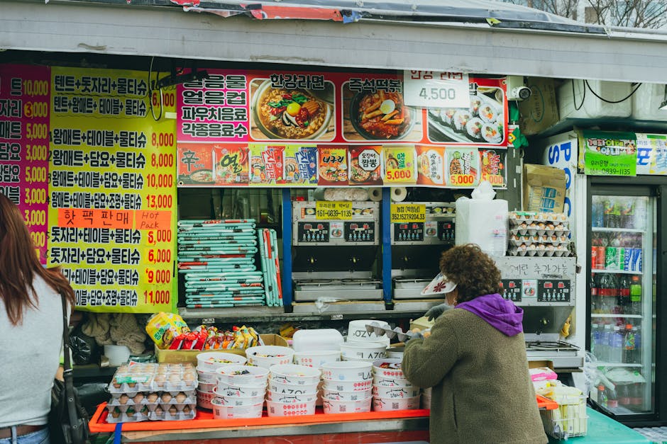 A vibrant Korean street food stall in Seoul, showcasing local culture and cuisine.