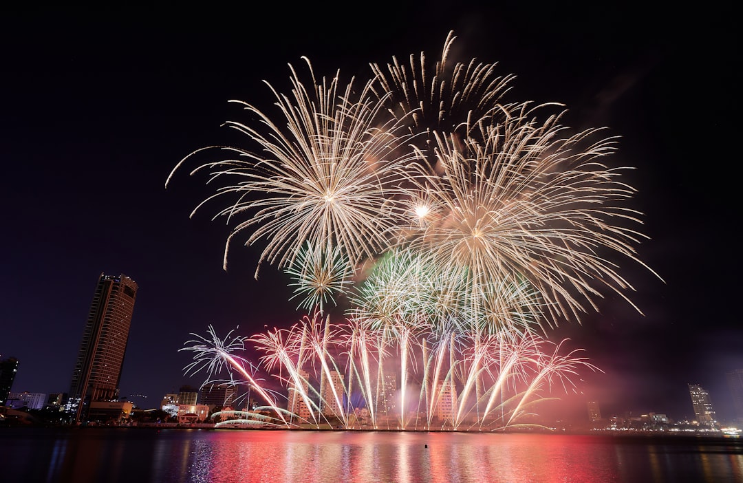 fireworks are lit up in the night sky over a body of water